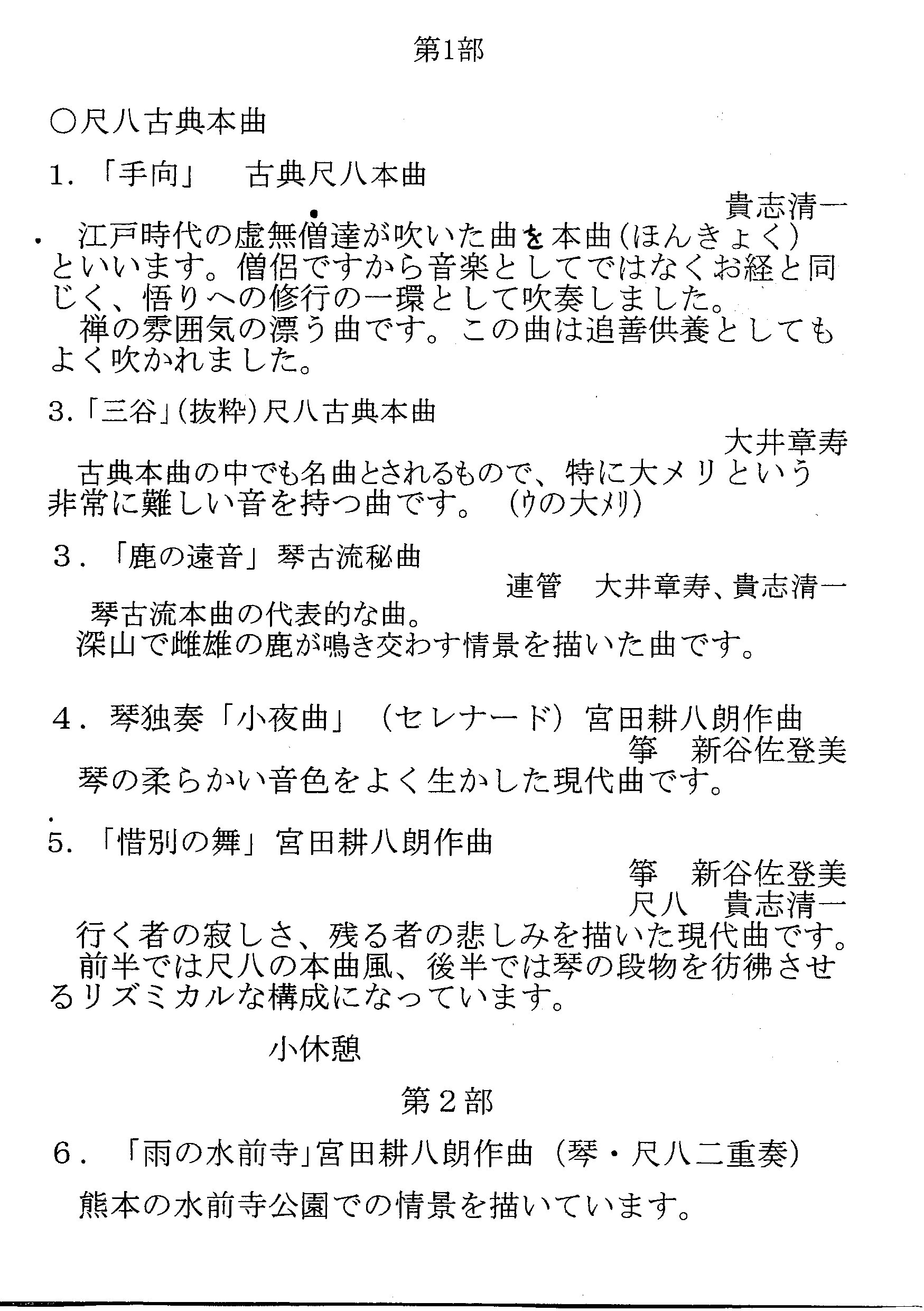 まずは、尺八曲の演奏3曲から始まりました。、古典本曲の中でも有名な 「手向(たむけ)」「三谷(さんや)」「鹿の遠音」の演奏でした。