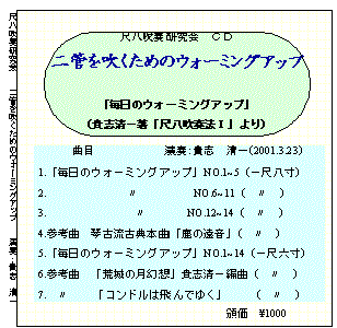 説明に入る前に、この問題の解決に役立つCDを作成しました。これは「尺八吹奏法T」付録の「毎日のウォーミングアップ」を一尺八寸、六寸の2管での実演と参考曲「鹿の遠音」、「荒城の月幻想」を収録しております。